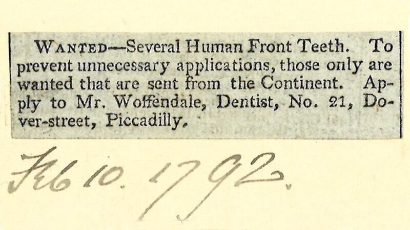 У 18-19 століттях зуби були дуже ходовим товаром — дантисти купували їх у бідних, просто вириваючи, а крім цього полювали за зубами померлих і страчених, підкуповуючи лікарів та міських катів. Справжні зуби, вставлені в штучну щелепу, виглядали більш-менш природно і служили довше за кістяні.