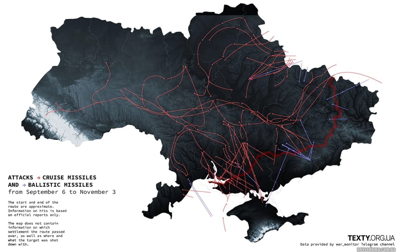 - Карта всіх зразкових маршрутів атак російської авіації на Україну з 6 вересня по 3 листопада.