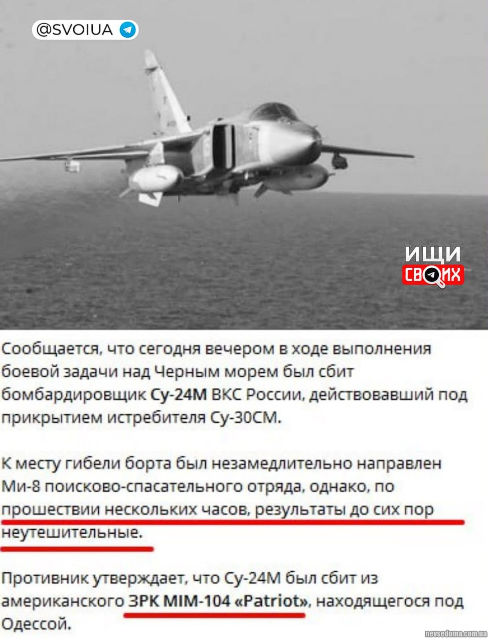 - Сьогодні в районі острова Зміїний був збитий Су-24М Повітряно-космічних сил Росії