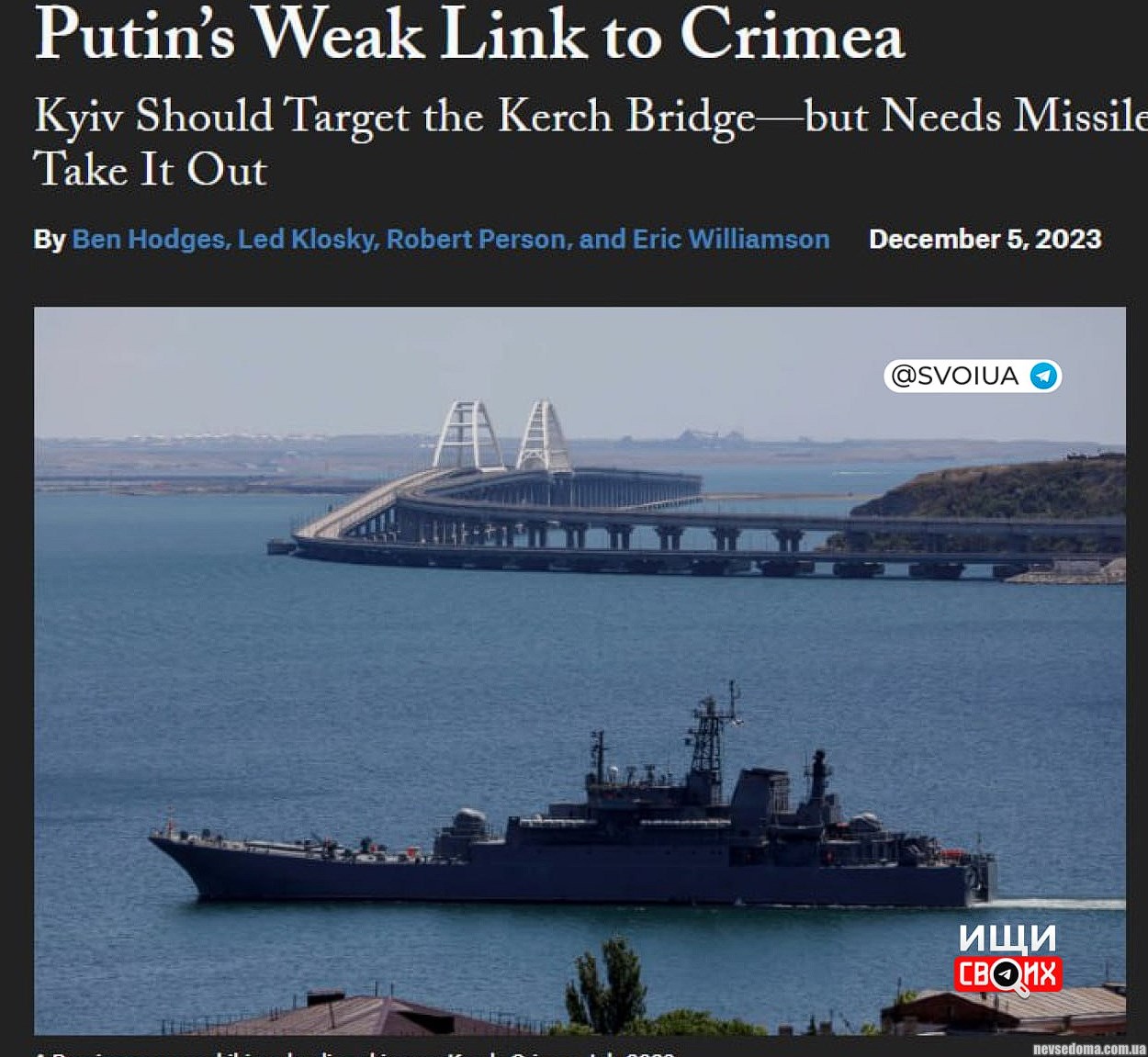 На думку Ходжеса, будівництво мосту є частиною стратегії Росії щодо встановлення домінування в Україні, і руйнація цієї інфраструктури може відіграти ключову роль в успіху України не лише в Криму, а й у ході військових дій загалом.