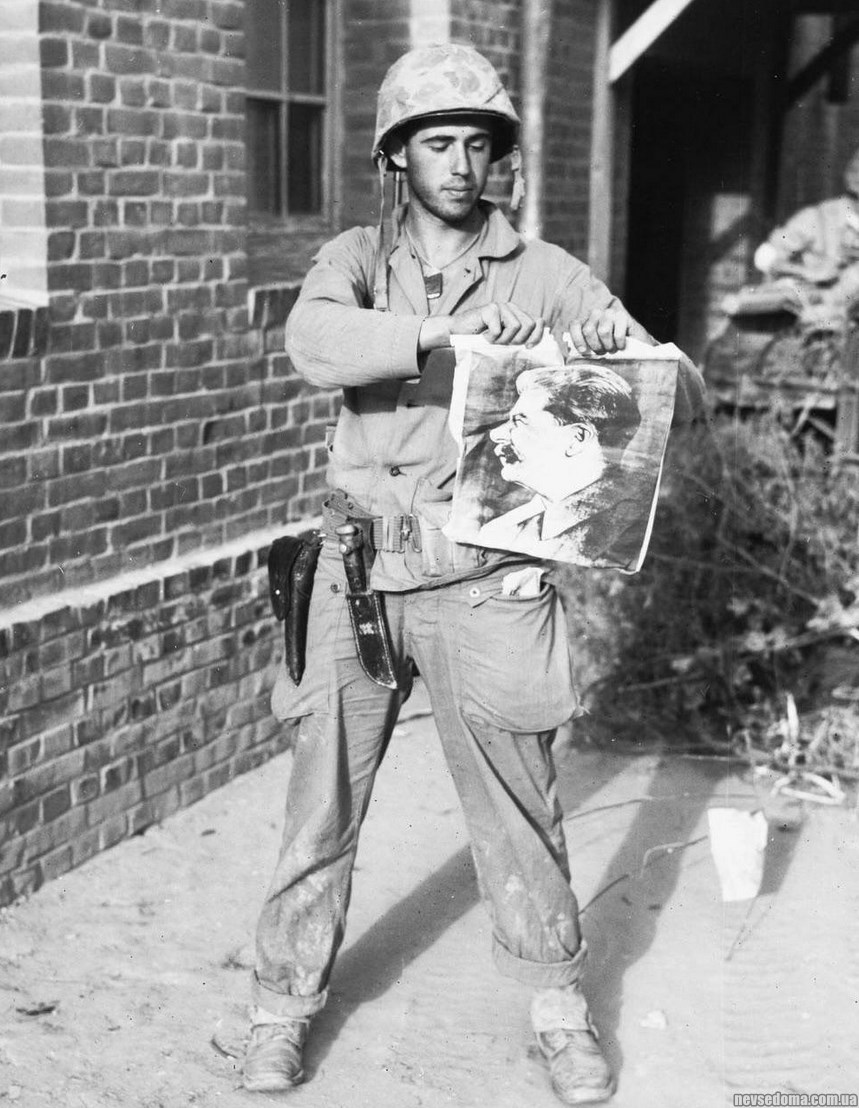 - Американський солдат рве портрет Сталіна. Корейська війна