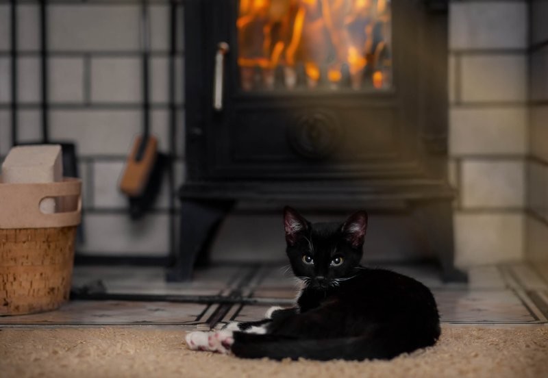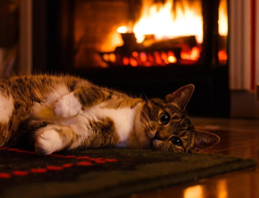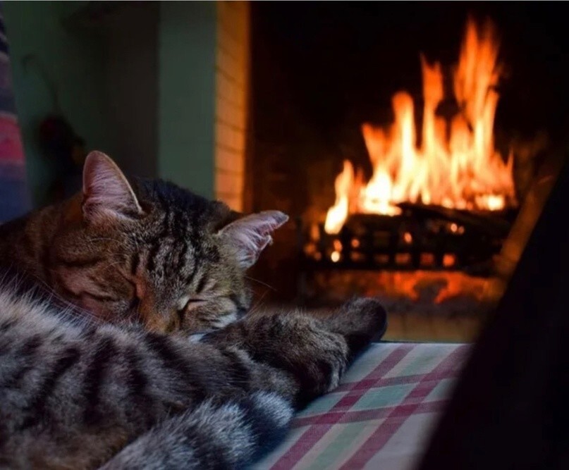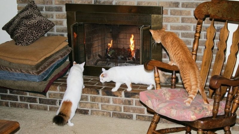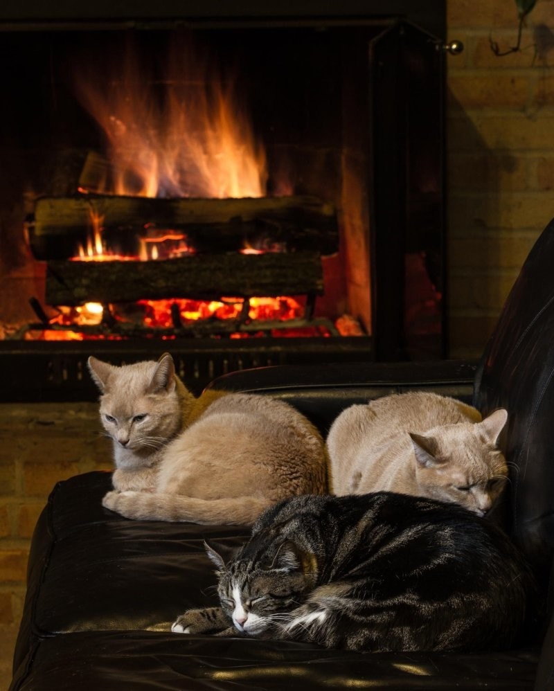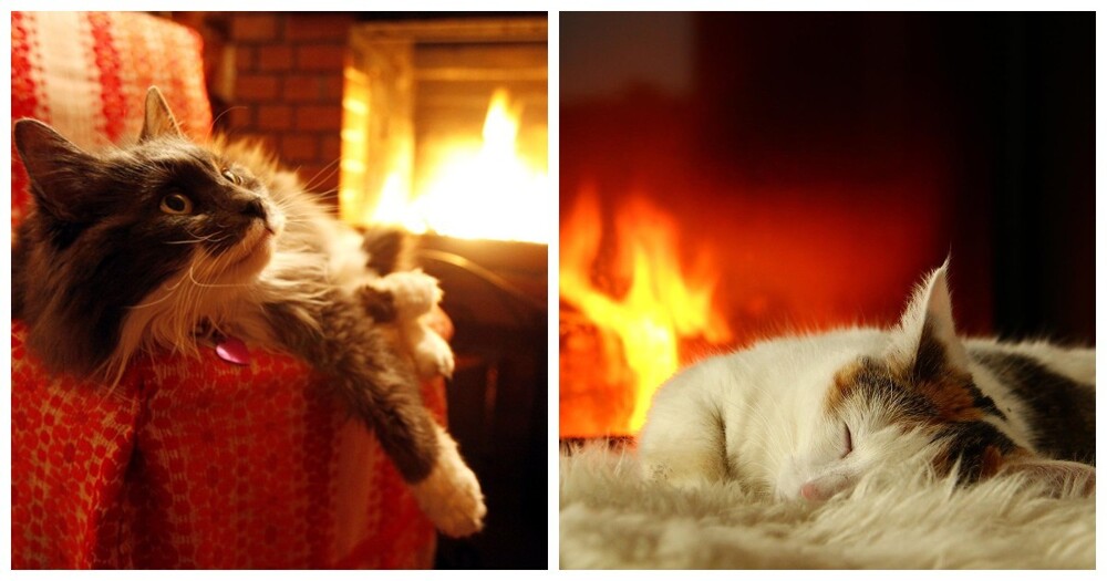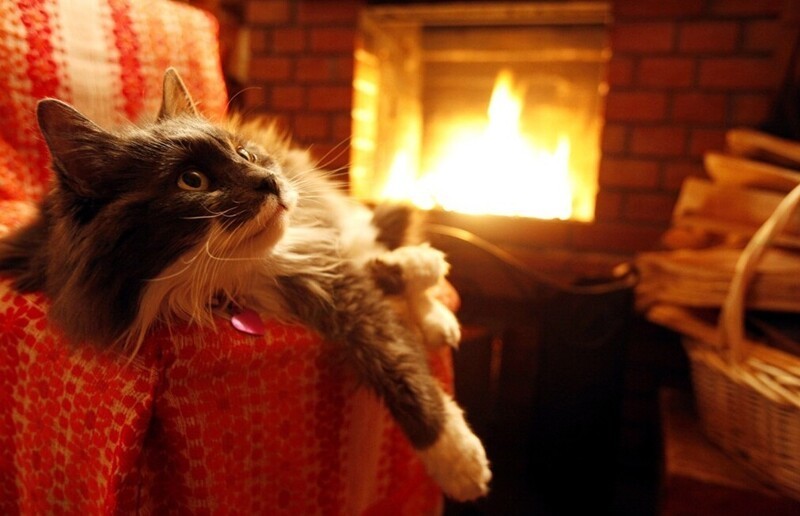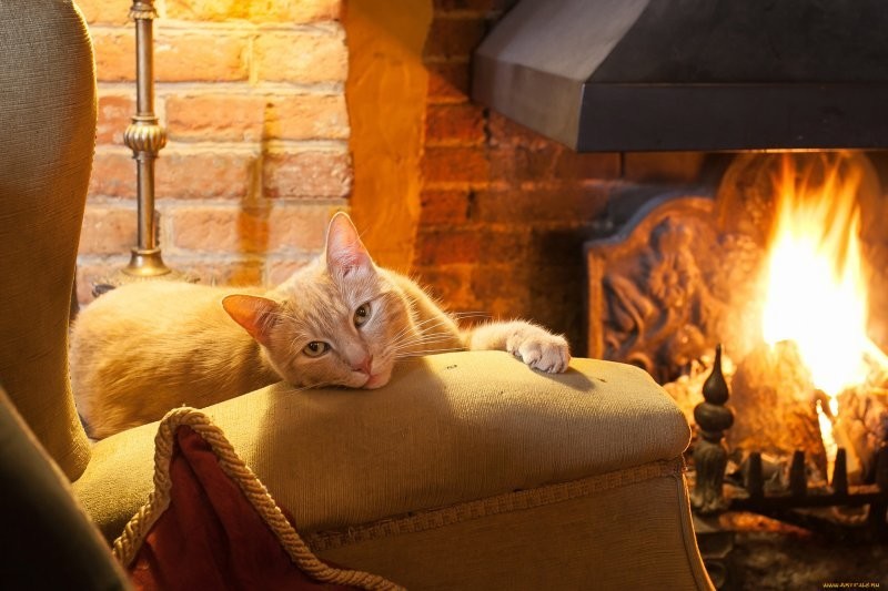 Якщо камін зігріває тіло, то душу зігріють котики, що сидять біля нього. До вогню вони ставляться насторожено (можливо, дається взнаки генетична пам'ять), але можуть годинами заворожено спостерігати за грою мов полум'я, оголошуючи простір утробним бурчанням. Кішка та камін – мабуть, ідеальний дует зимового інтер'єру.