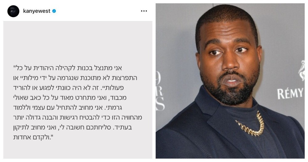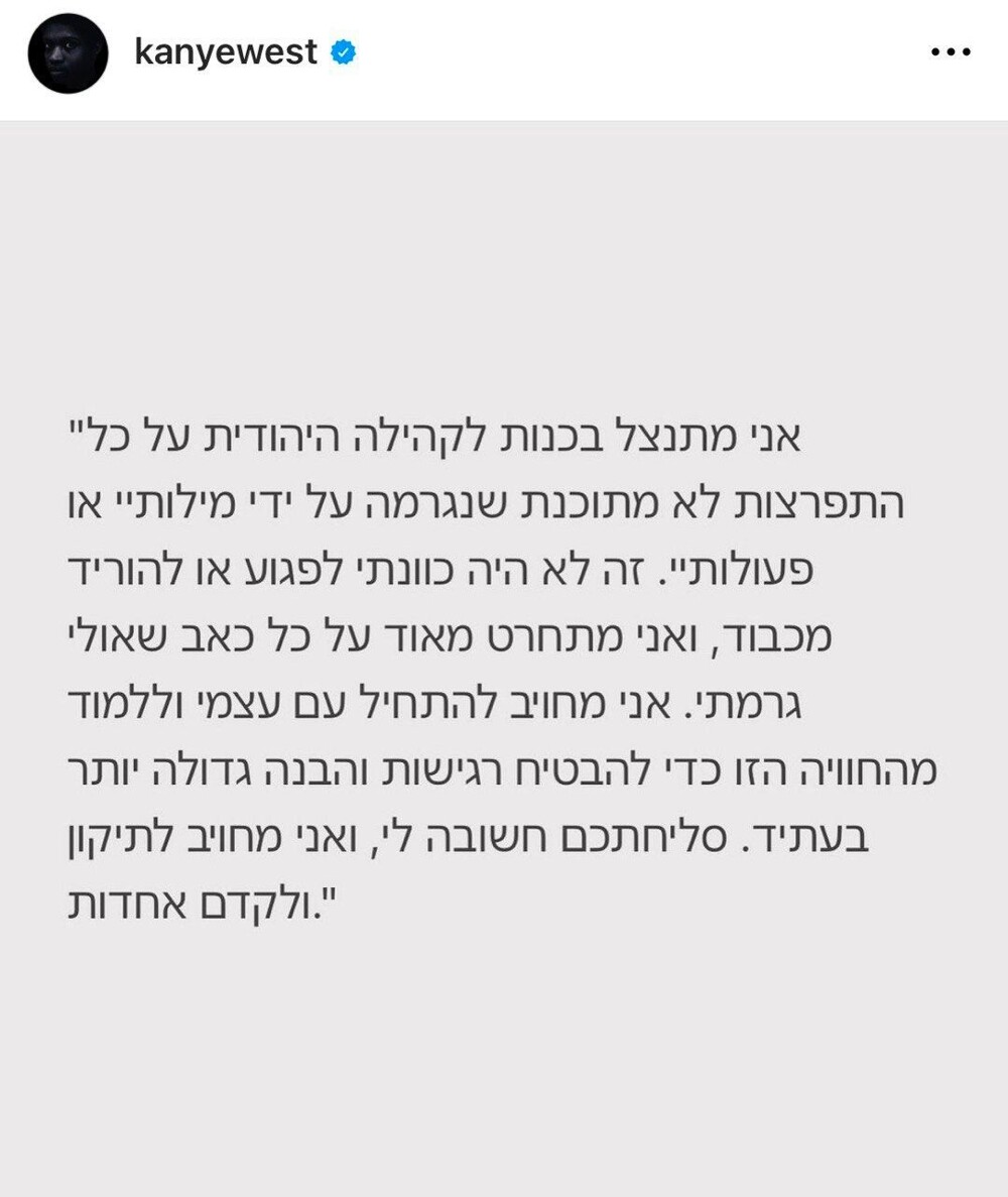 Я щиро прошу вибачення єврейському суспільству за будь-який ненавмисний сплеск, викликаний моїми словами або діями. Я не збирався завдавати болю або показувати неповагу, я глибоко шкодую про будь-який біль, який міг завдати. Я маю намір почати з себе і винести уроки з цього досвіду, щоб більше відчувати і розуміти в майбутньому. Ваше прощення є важливим для мене і я готовий спокутувати провину і сприяти єдності.