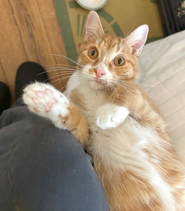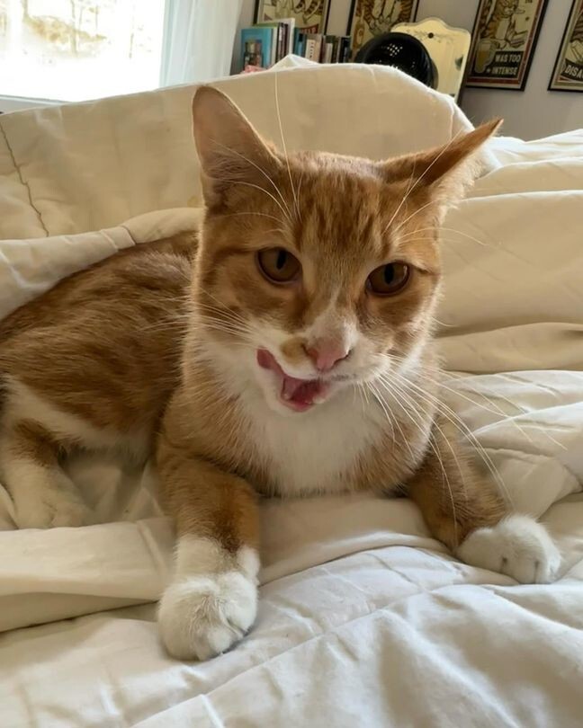Кота назвали Мамбо. Він був голодний, виснажений і наляканий. Шипів і кидався на всіх. У притулку боялися, що з таким характером важко буде знайти йому будинок. Але через кілька днів реабілітації, Мамбо став спокійніше і перестав нападати на людей.