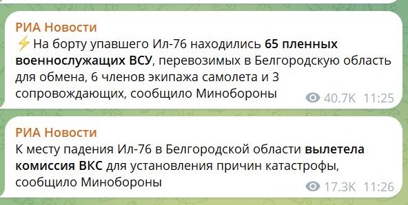 У російському Міноборони заявили, що на борту літака були українські полонені, яких вивозили для обміну.