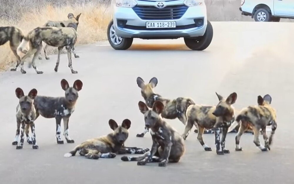 У Національному парку Крюгера (ПАР) гієноподібні собаки спровокували невелику пробку на дорозі. Дорослі особини та молодняк вирішили зробити зупинку та завадили проїзду машинам з туристами.