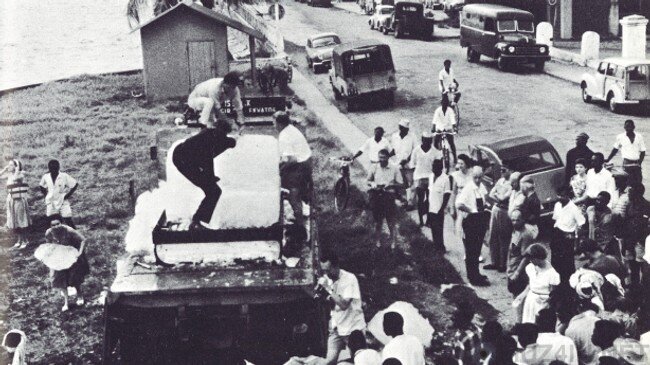 Отже, в 1959 році ті самі чоловіки, а, точніше, співробітники норвезької компанії "Glassvatt", що спеціалізується на виробництві теплоізоляції приміщень, доставили через полярне коло (з містечка Му-і-Рана) тритонну брилу льоду - причому доставили ні куди. небудь, а в Африку - в місто Лібревіль, до самого екватора.