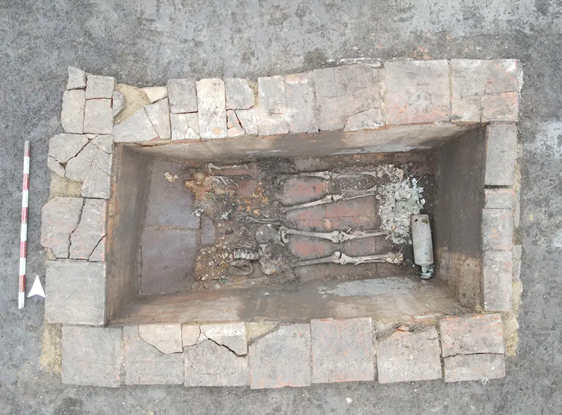 Обидві гробниці виготовлені з цегли, і всередині обкладені штукатуркою. На них також лежала велика вапнякова плита. У могилі більше, довжиною близько трьох метрів, знайшли останки двох дорослих — чоловіка і жінки, яким на момент смерті було близько 45-60 років, — похованих разом із прикрасами, монетами, керамічними та скляними судинами.