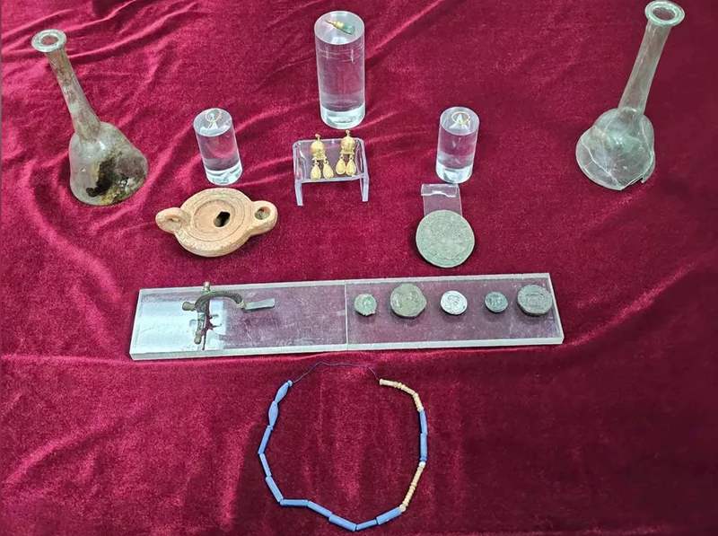 Крім прикрас зі скляних намистин та золота, у гробницях знайшли шість монет, що датуються 200-225 роками н. е., а також лампу, шкіряну туфель і кілька скляних пляшок. Три з них називаються "лакримаріями" і призначені для збирання сліз скорботних. Наразі всі артефакти знаходяться у музейній лабораторії, де їх вивчають та реставрують.