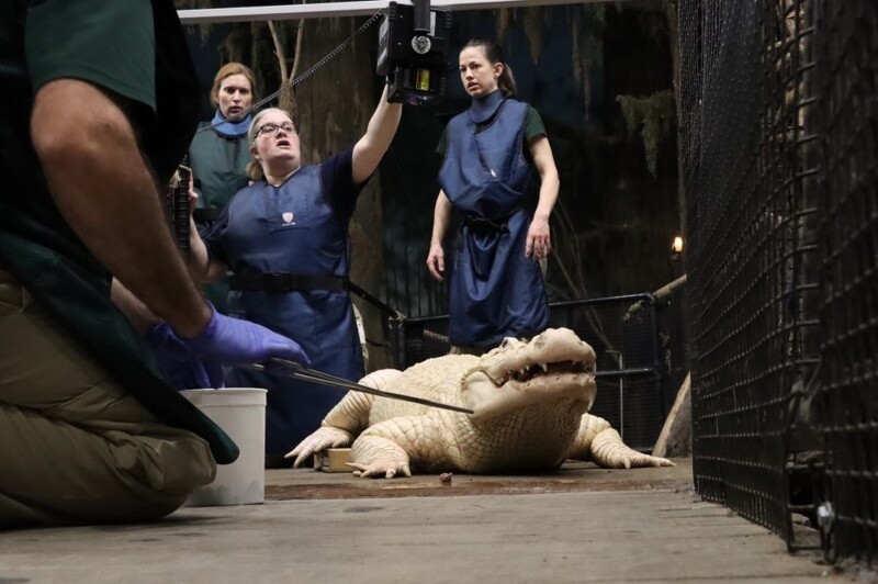 "Щоб захистити тварину та безпечно пропустити інструменти, що використовувалися для вилучення монет, а також камеру, яка допомогла нам бачити ці предмети, у роті алігатора було встановлено пластикову трубку", - йдеться у заяві ветеринара зоопарку Христини Плуг.