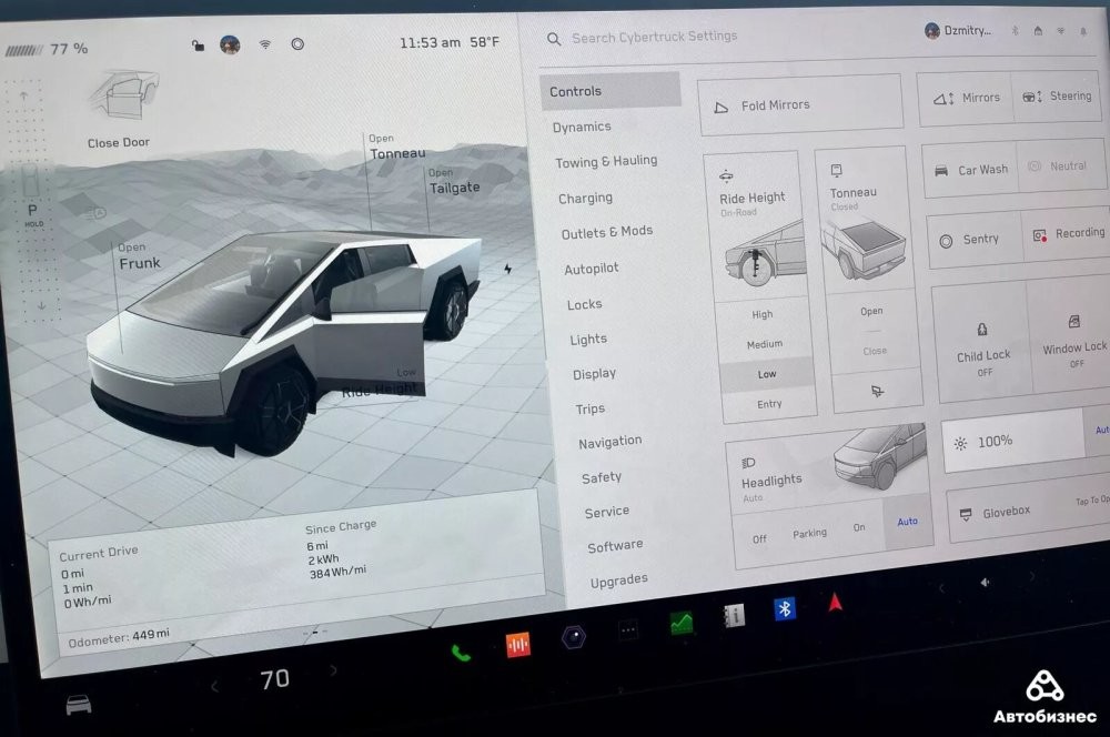 У автомобіля три режими керування. Є Chill – розслаблений режим, Comfort та Sport. Sport Cybertruck управляється дуже чітко, плюс задні колеса підрулюються. Звичайно, вага відчувається, все-таки машина важить 2700 кг, але в спортивному режимі вона розганяється від нуля до 100 км/год приблизно за 4 секунди. І я б не сказав, що вона при цьому хитка і дуже відрізняється від якогось великого седана. Звісно, якщо порівнювати з моєю попередньою Model 3, то та більш вузька. При цьому радіус розвороту у Cybertruck, на мою думку, мало не такий самий, як у маленької «трійки». Знову ж таки це за рахунок того, що задні колеса повертаються.