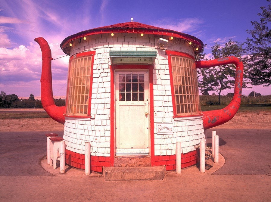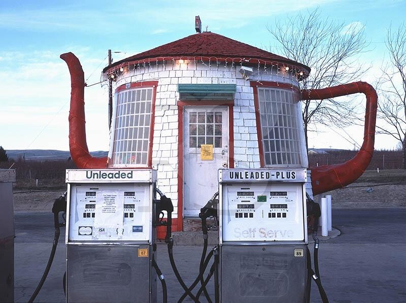 Старі заправки в невеликому містечку Зілла, Вашингтон, США. Побудована у 1920-х роках як політична заява, ця маленька акуратна колишня заправна станція виглядає як чайник. У липні 2012 року вона була відреставрована та перенесена на своє нинішнє місце у західній частині міста. Чайник обладнали непрацюючими старовинними бензоколонками і став туристичним центром.