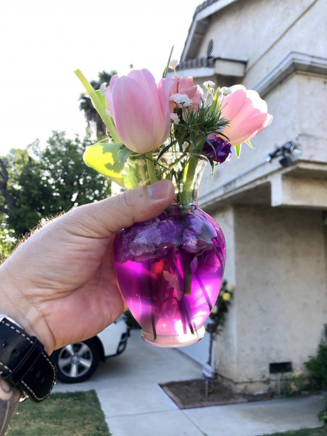 Фіолетові квіти фарбують воду. Це сталося тому, що фіолетові квіти були пофарбовані, і фарба просочилася у воду. З рослинами, які не зазнали штучної пігментації, такого не станеться.