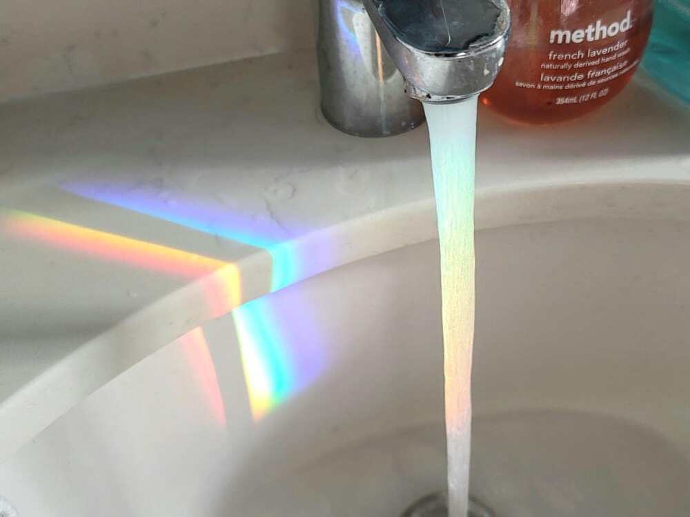 Веселка переломилася від скляних дверей душа і ідеально збіглася з потоком води в раковині