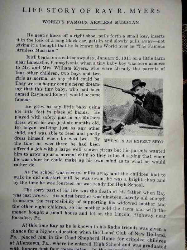 До 1953 Рей Майерс вів щоденне радіошоу на каналі WPDX в Кларксбурзі, Західна Вірджинія. Крім унікальності своєї гри, Майєрс ще високо цінувався як класичний музикант. Його довге перебування на посаді радіоведучого, коли ніхто не бачив, що він не має рук, є одним із свідчень його здібностей.