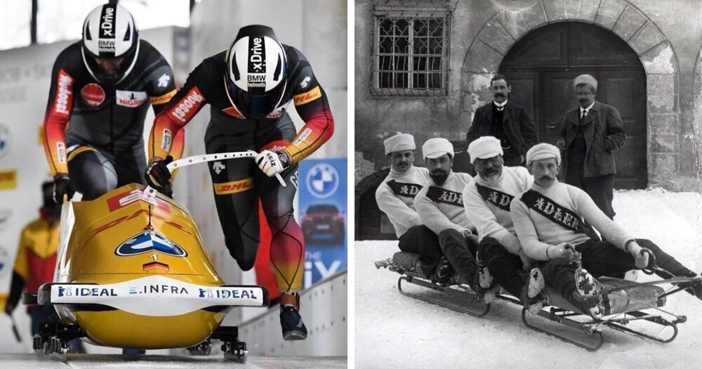 Пара німецьких бобслєїстів на чемпіонаті світу 2021 року та швейцарська четвірка бобслєїстів 1910-х років.