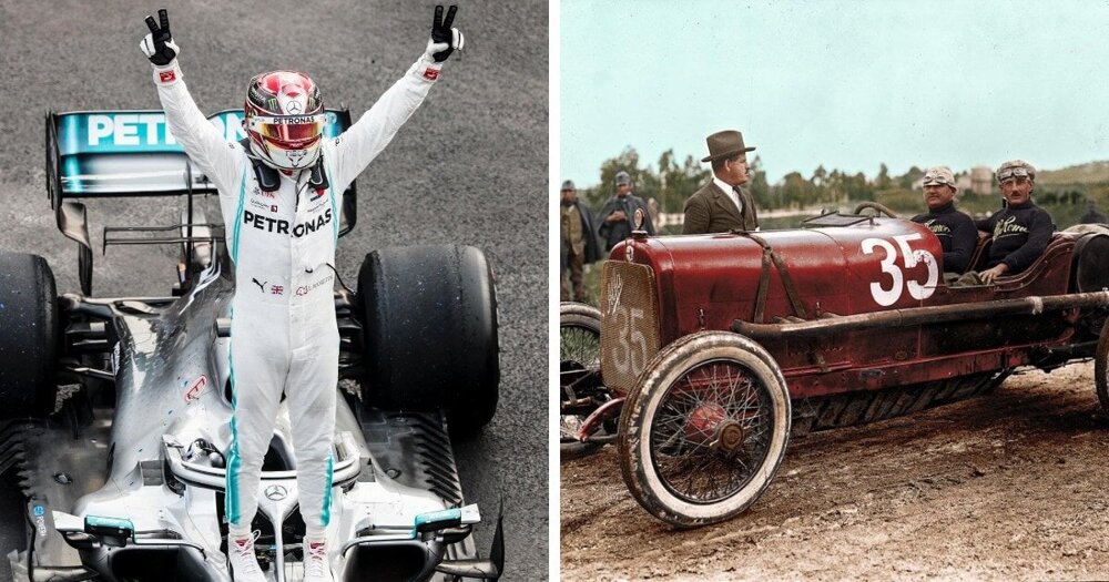 Чемпіон гонок Формули-1 Льюїс Хемілтон (Великобританія) та італійські автогонщики 1920-х років Антоніо Аскарі та Уго Сівоччі.