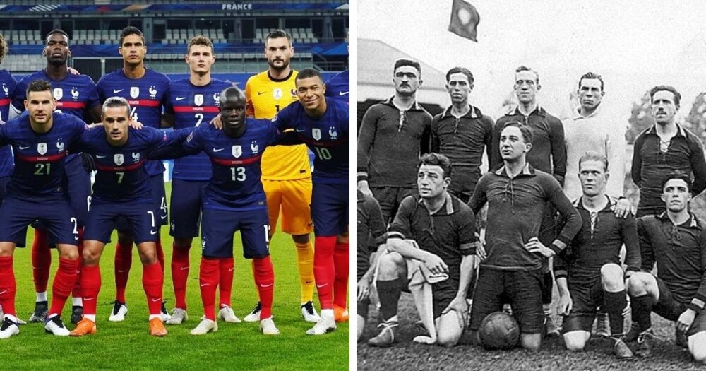 Збірна Франції з футболу зразка кінця 2020 року та збірна Бельгії 1920 року (олімпійські чемпіони того року).