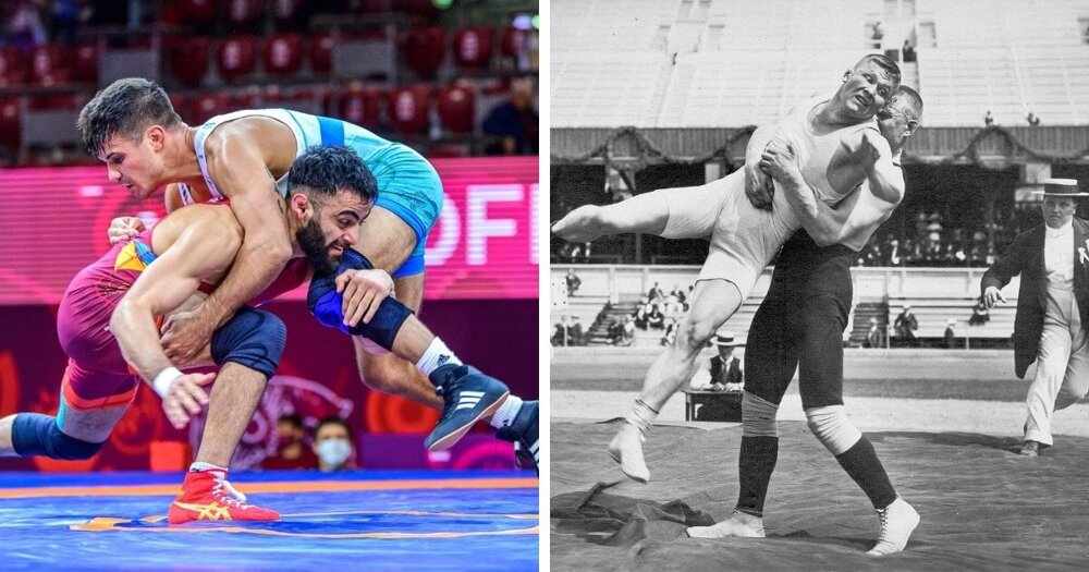 Учасники олімпійського кваліфікаційного турніру з боротьби 2021 року та борці Мартін Клейн та Альфред Асікайнен на Олімпійських іграх 1912 року.