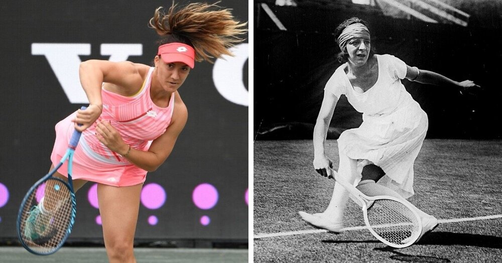 Чорногорська тенісистка Данка Ковініч на змаганнях у 2021 році та французька тенісистка Сюзанн Ленглен, олімпійська чемпіонка 1920 року.