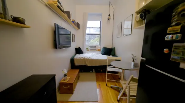 24-річний Алекс Верхег живе у маленькій квартирі у манхеттенському районі Іст-Віллідж. Її площа — 9 квадратних метрів, а це менше середнього розміру місця для паркування. У квартирі немає ванної кімнати. Натомість у п'ятиповерховому будинку є три ванні кімнати та дві душові на кожному поверсі, які мешканці використовують спільно.