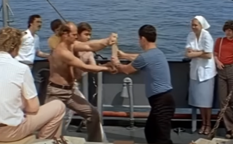 17. Відстань від берега до корабля була занадто великою, тому дострибнути було неможливо. Для того, щоб втілити такий стрибок, на екрані довелося знімати два різні дублі. У першому дублі Єрьоменко стрибав у воду, а в другому він уже чіплявся за огорожу.