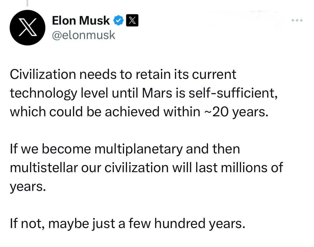 Цивілізації необхідно зберігати свій нинішній технологічний рівень доти, поки Марс стане самодостатнім, що можна зробити приблизно за 20 років.