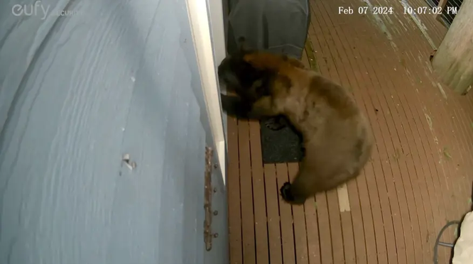 На кадрах, які Холт виклала у соціальні, видно, як ведмідь обережно забирається на огорожу біля ґанку і, стоячи на двох задніх лапах, обнюхує все довкола. Потім він спускається на ґанок і заглядає у вікно.