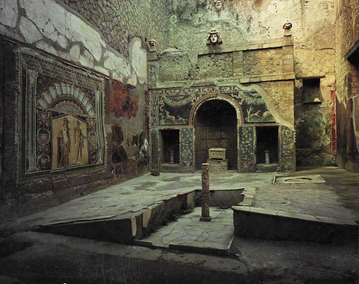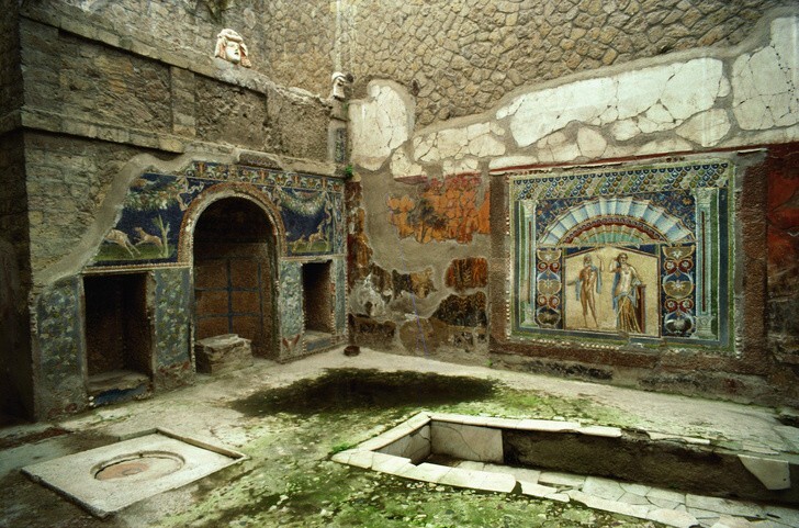 Це одне з небагатьох стародавніх міст, що збереглися майже незайманими: від пограбування його захистив попіл, що покривав місто. Античний майстер зобразив на мозаїці бога морів Нептуна та німфу Амфітріту.