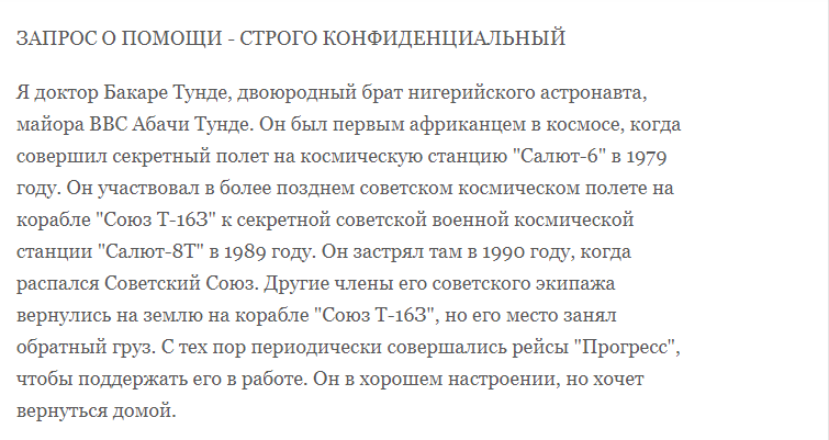 А один чудовий лист містить прохання про збір коштів для нігерійського астронавта на ім'я майор Абача Тунде, який застряг на борту секретної радянської космічної станції з 1990 року, і йому потрібно 3 мільйони доларів, щоб сплатити зворотний переліт на Землю.