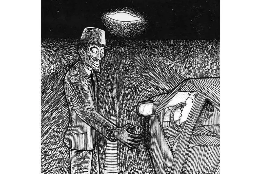 Двері дивної конструкції відчинилися, і з неї вийшла людина. За словами Деренбергера, ця людина була багато в чому звичайною – середнього зросту, засмагла, темноволоса, з класичною стрижкою. Ось тільки надзвичайно широка усмішка виглядала дивно.