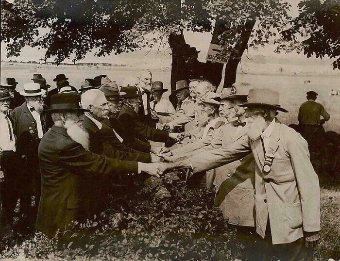 23. Ветерани Союзу (ліворуч) та Конфедерації (праворуч) зустрічаються на честь 50-х роковин битви при Геттісберзі в 1913 році