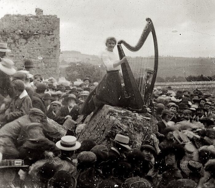 18. Молода жінка грає на арфі перед натовпом, Кашельська скеля, Ірландія, прибл. 1910 р.
