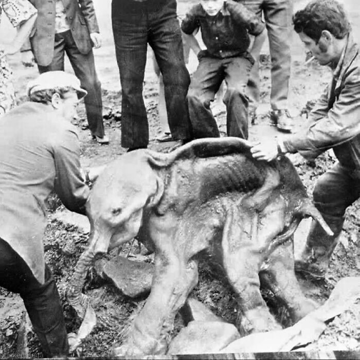 10. Чоловіки витягують тушу мамонтенка, що збереглася, і був випадково викопаний з вічної мерзлоти в Сибіру в 1977 році шахтарським бульдозером