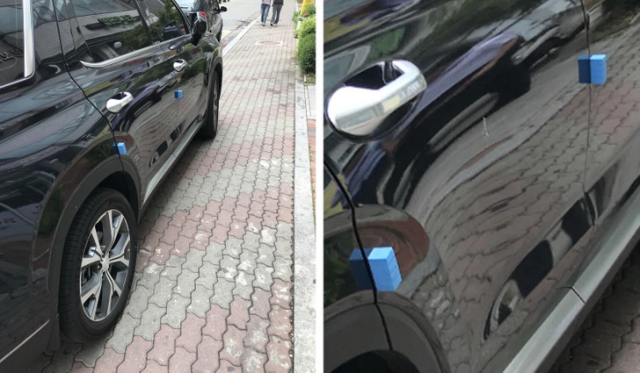 Виробник встановлює такі сині блоки, щоб захистити двері під час транспортування, а люди не прибирають їх, щоб не подряпатися на парковці.