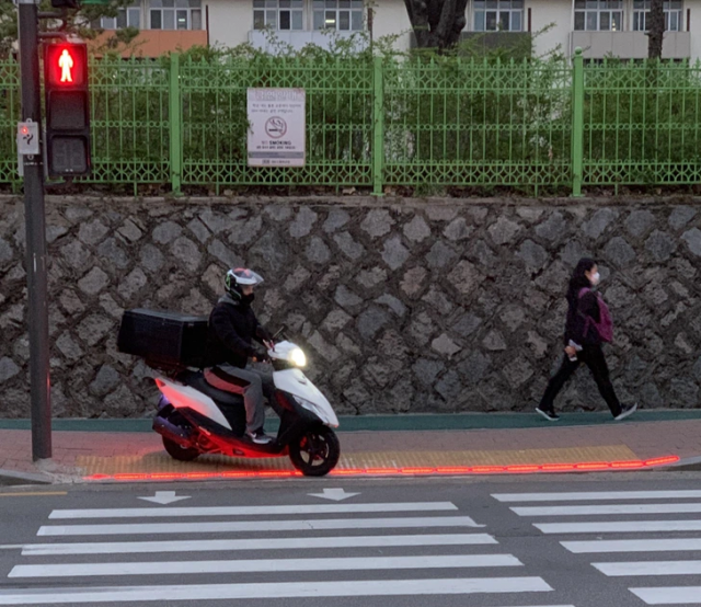 Колір світлофора також відображається на землі. Так люди, які дивляться в телефони, бачать сигнал, що горить