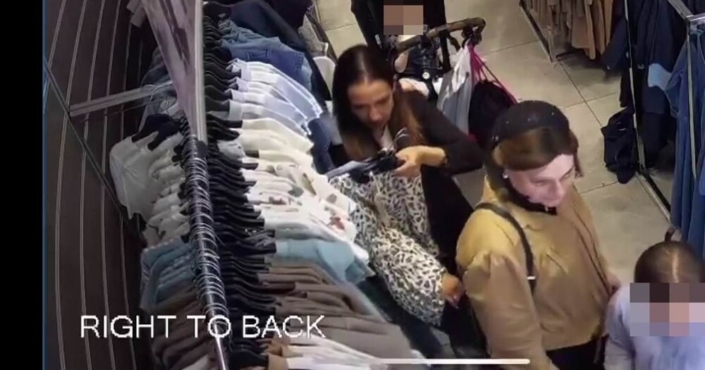 Злодійка у темному одязі, взявши з вішалки кілька предметів одягу, притирається ближче до жінки з коляскою. Вона знаходиться у неї за спиною, в одній руці тримає вішалку з одягом і використовує її, щоб прикрити другу, «робочу» руку.