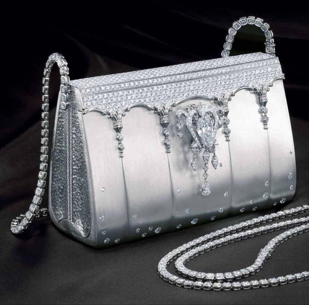 Сумка виконана з платини та 2000 діамантів. Найбільший дорогоцінний камінь, що знаходиться по центру аксесуара, має вагу 8 карат.