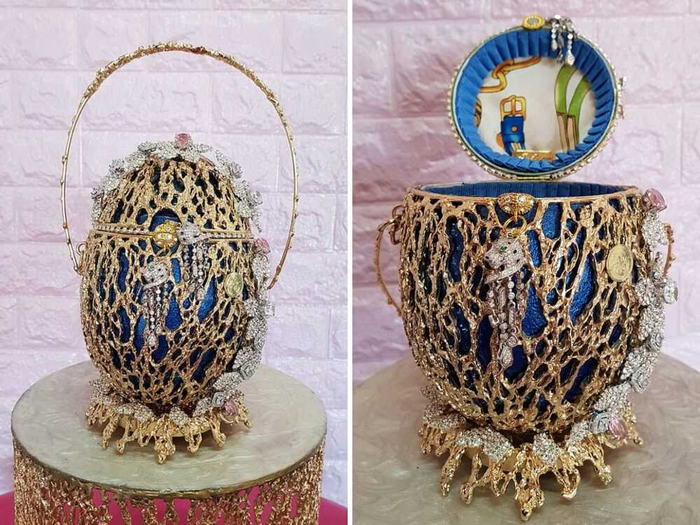 Гаманець ручної роботи зроблений із шкаралупи яйця страуса ему, переробленого шарфа Hermès, 8000 блискучих діамантів та сережок Cartier, використаних як застібка.