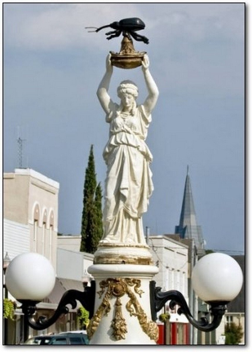 Елегантний з претензій на відповідність кращим класичним традиціям пам'ятник довгоносику, споруджений у 1919 році, об'єкт рідкісний та унікальний. Дивно, але витончену скульптуру споруджено на честь сільськогосподарської загрози. Шкідник, що знищує посіви бавовнику, колись був бичем фермерів усього американського Півдня та деяких районів Мексики та Південної Америки.