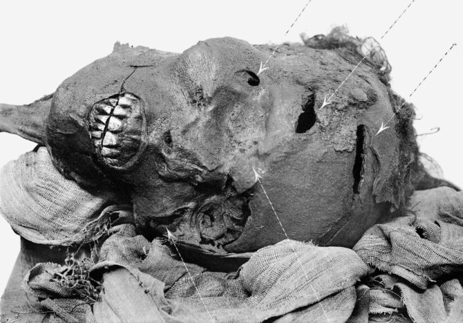 Щоб встановити причину смерті, вчені скористалися інформацією з попередніх досліджень: перший удар сокирою було завдано в праву нижню лобову частку та ліву щоку.