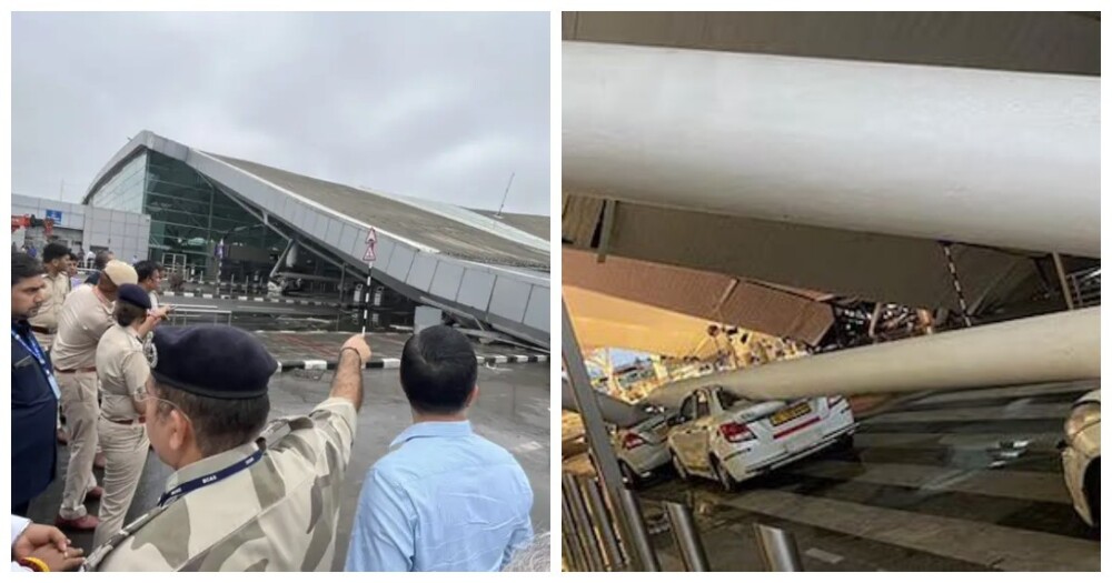 Покриття частини даху та опорні балки аеропорту в Делі не витримали потоку зливи та обрушилися прямо на авто, припарковані у зоні посадки та висадки.