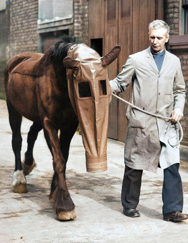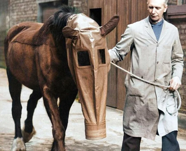 Один із найдивніших пристроїв часів війни — кінські протигази. Їх розробили у 1943 році для захисту коней від газових атак.