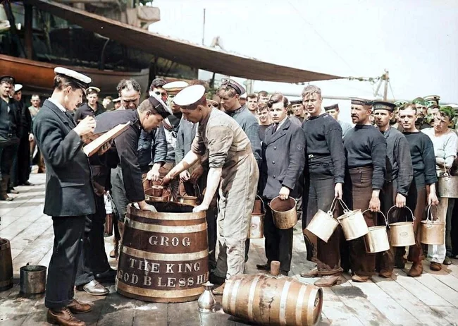 Моряки лінкора Його Величності Георга V набувають добової норми грога. Ця традиція була скасована на Королівському флоті лише 1970 року через побоювання, що тремтіння рук після прийому алкоголю може порушити виконання робіт.