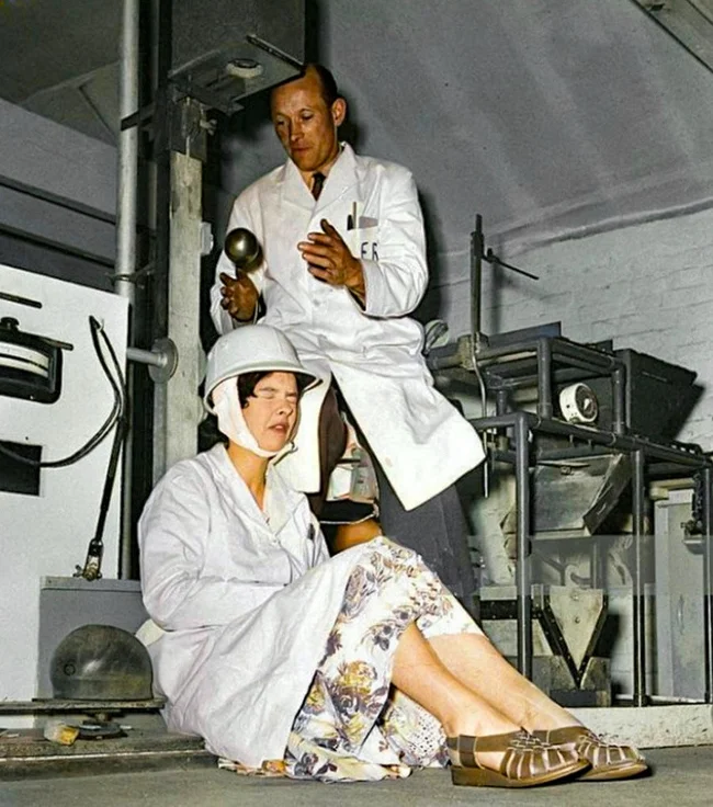 Працівник дослідницького центру «Eliis Research laboratory» тестує мотоциклетний шолом, кидаючи на нього сталеву кулю, 1957 рік.