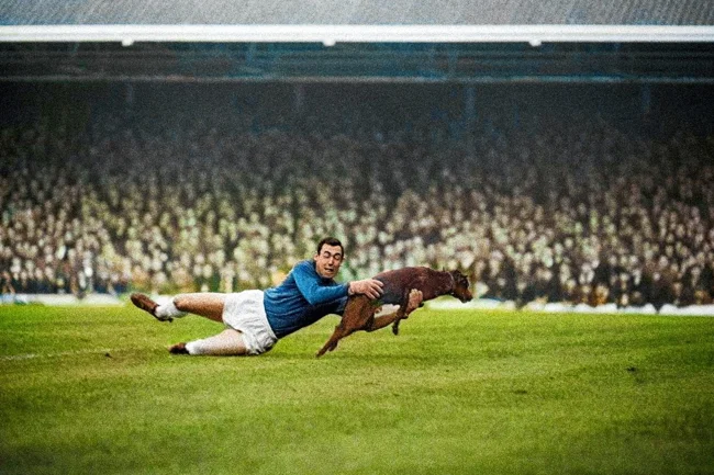 Воротар «Лестер Сіті» Гордон Бенкс ловить собаку, що вибіг на поле, під час матчу англійської прем'єр-ліги з «Манчестер Юнайтед», Англія, 1965 рік.