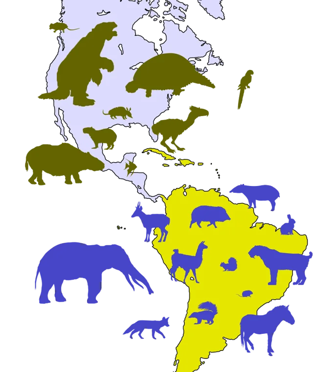 Ця подія має назву: Великий Міжамериканський Обмін. Усі тварини, позначені синім, мали у предках звірів із Північної Америки. І навпаки: тварини, позначені оливковою, мали у предках тварин із південного континенту.