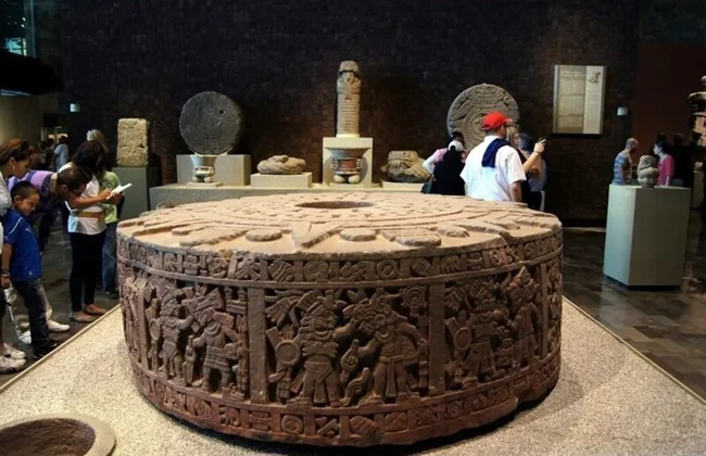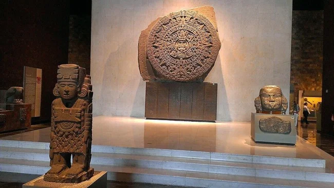 Так, із центральним круглим об'єктом все зрозуміло: це Сонячний камінь ацтеків, також відомий як Календарний камінь. Описаний як «Годинник Монтесуми», він вважається, мабуть, найвідомішим на планеті твором ацтекської іконографії і був виявлений в 1790 під час будівельних робіт на площі в центрі Мехіко, де колись знаходилося ацтекське святилище.