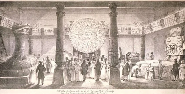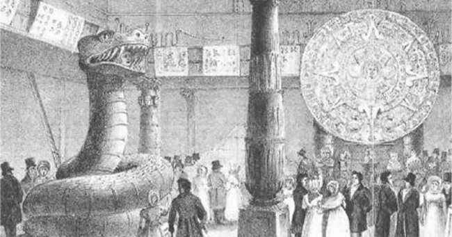 На гравюрі зображено виставку «Давня Мексика» в лондонській залі Пікаділлі, яку проводив Вільям Баллок. На ній були представлені давні артефакти цивілізації ацтеків.