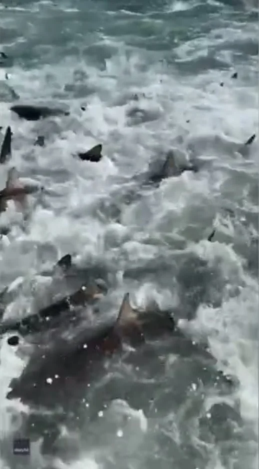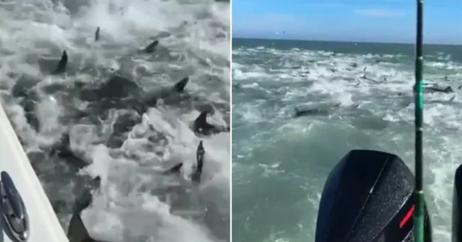 Рибалка Діллон Мей шукав жовтого тунця, коли він зняв на камеру цю хаотичну сцену. Він сказав, що в той час він був зі своєю дівчиною, і акули рухалися в такому божевіллі, що вода постійно потрапляла на судно.